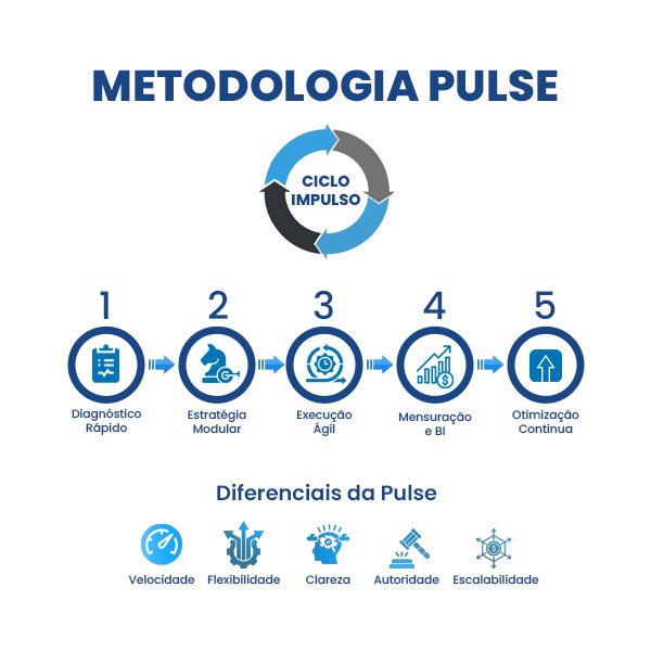 - Metodologia Pulse (Ciclo ImPulse): diagnóstico em 5 dias, execução ágil e BI transparente.